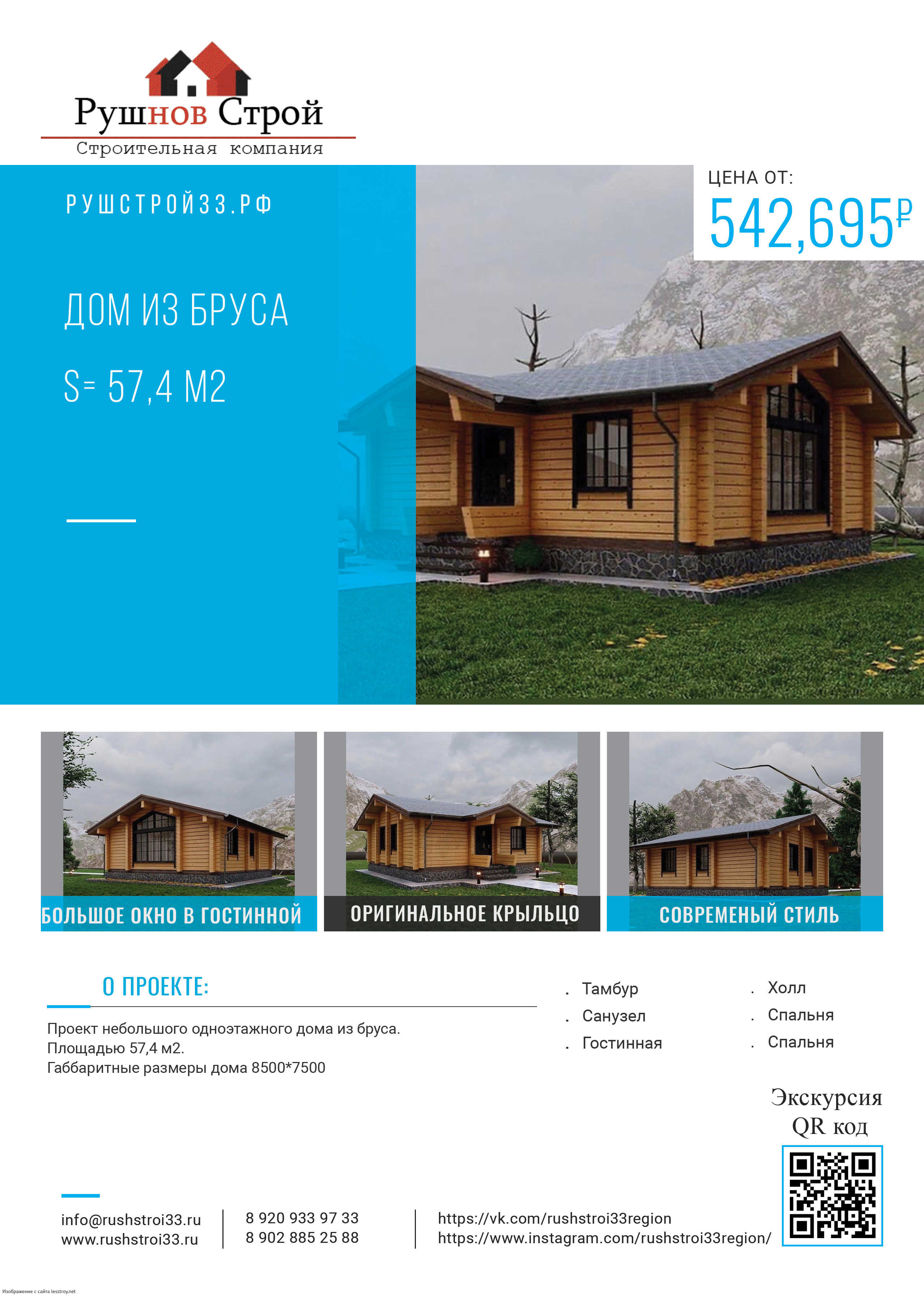 Дом, который растёт и меняется вместе с вами. Площадь 57 м² — оптимум для тех, кто ценит порядок и воздух. Это одноэтажная структура, которая создаёт идеальные условия для жизни всей семьи. Дом спроектирован в духе дома в стиле русский. Проект включает 2 спальни — удобно для семьи.Характеристики