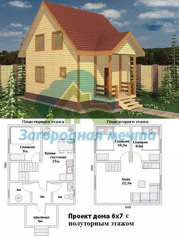 Проект одноэтажного дома Дом из бруса 7х6 м. с полуторным этажом.Проект 58Бр.