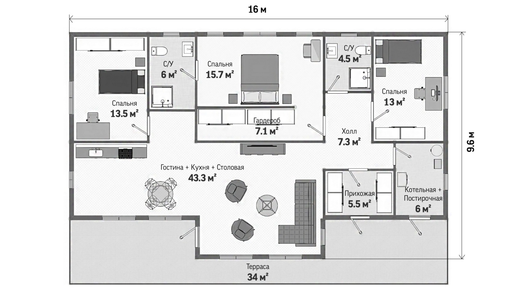 Проект одноэтажного дома Просторный, под ключ, ламинат, двери Экошпон, отделка Hauberk, коммуникации, сантехника.