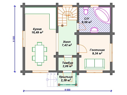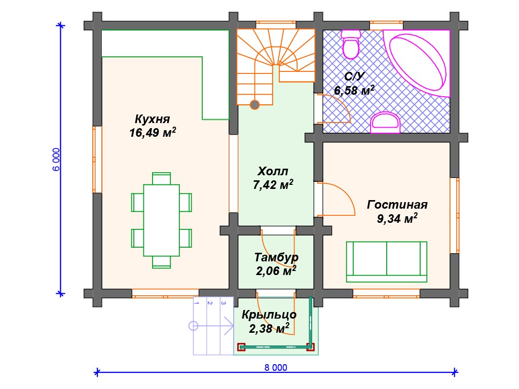 - Стены 1 этажа: Профилированный брус «Гребенка» с сечением 140х140 мм. Межвенцовые соединения бруса – металлические нагеля. ( Возможна замена на: березовые нагеля и узлы силой ).