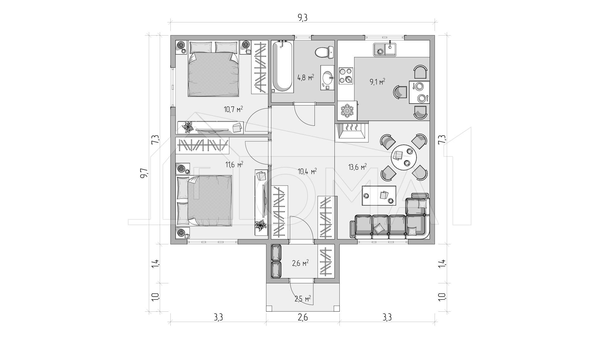Проект, в котором каждая деталь подчеркивает гармонию формы и функциональности. С площадью 63 м² и жилыми 47 м² дом идеален для уютной жизни. Керамоблок обеспечивает надежность и тепло, а продуманная планировка делает пространство удобным. Светлые интерьеры наполнены воздухом, создавая ощущение простора.Характеристики