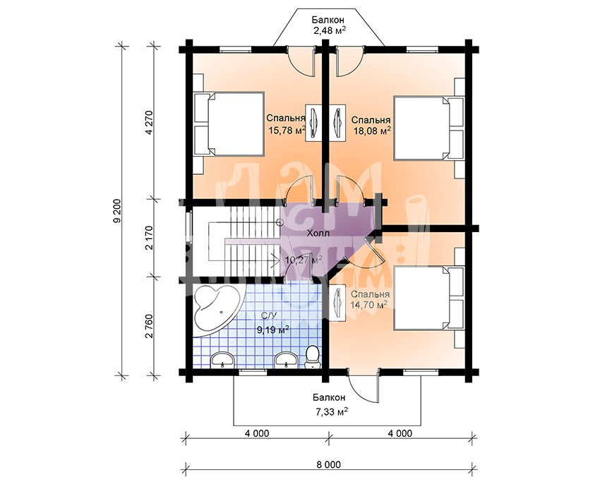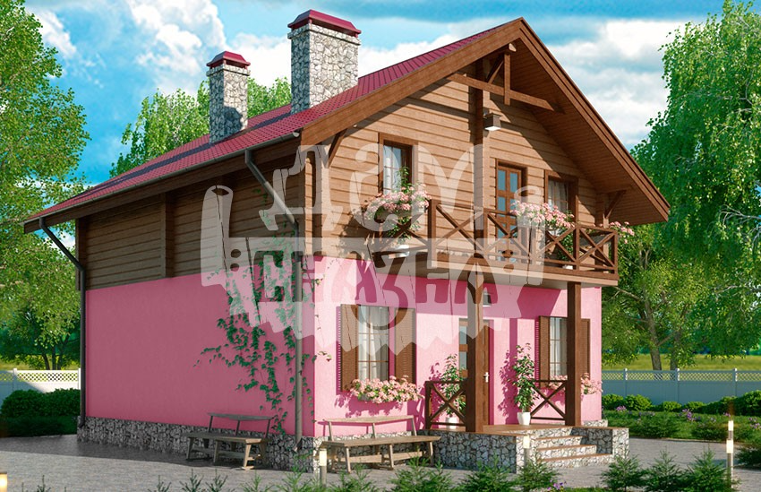 - Профилированный брус камерной (W 16-18%) сушки, размером 140х140 мм. Запилен «конструктором» в производственных условиях «без остатка» с креплением при помощи дубовых «бабочек» по нагельно-шпилечной технологии. Высота этажа 2,6 м при высоте боковой аттиковой стены 1,2 м.