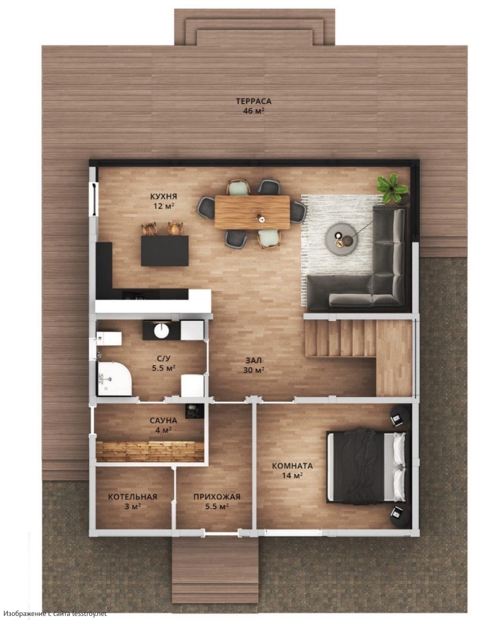 Дом, где хочется обнимать подушки и целовать обои. Дом даёт 115 м² для отдыха, творчества и общения. Двухэтажная рациональная планировка создаёт идеальные условия для жизни всей семьи. Стены из Брус хорошо держат тепло и защищают от шума. Проект включает 4 спальни — удобно для семьи.Характеристики