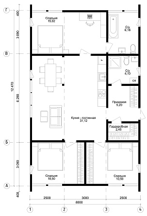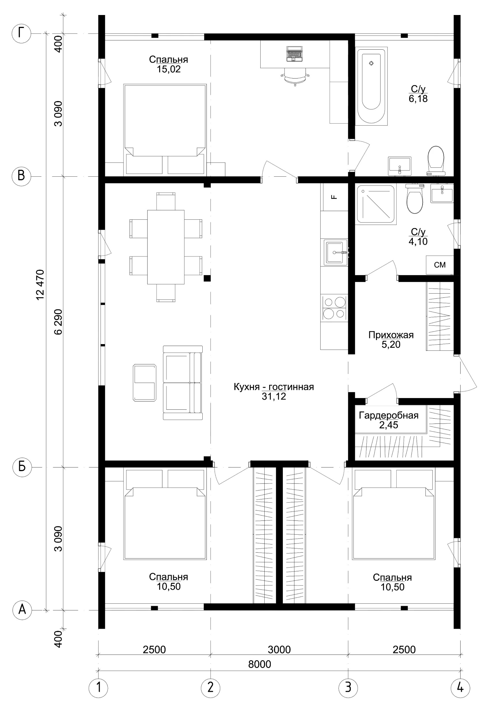 Проект одноэтажного дома Просторный, под ключ, ламинат, двери Экошпон, отделка Hauberk, коммуникации, сантехника.