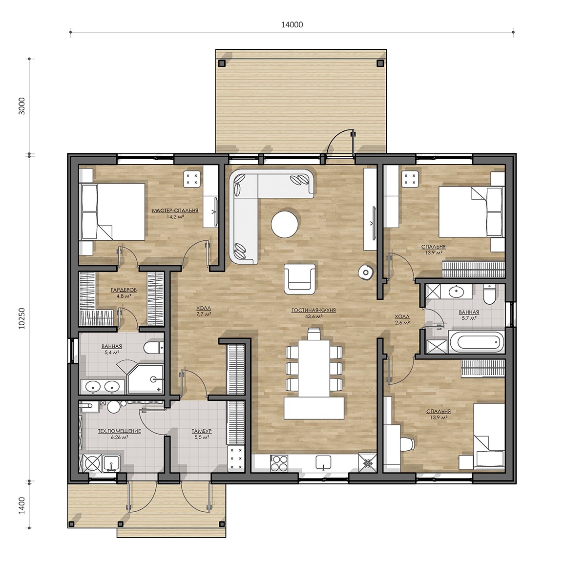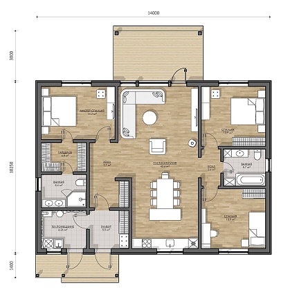 Проект одноэтажного дома Просторный, под ключ, ламинат, двери Экошпон, отделка Hauberk, коммуникации, сантехника.