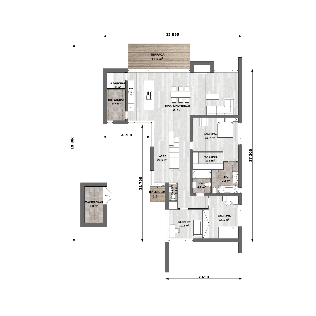 Проект одноэтажного дома со вторым светом и террасой