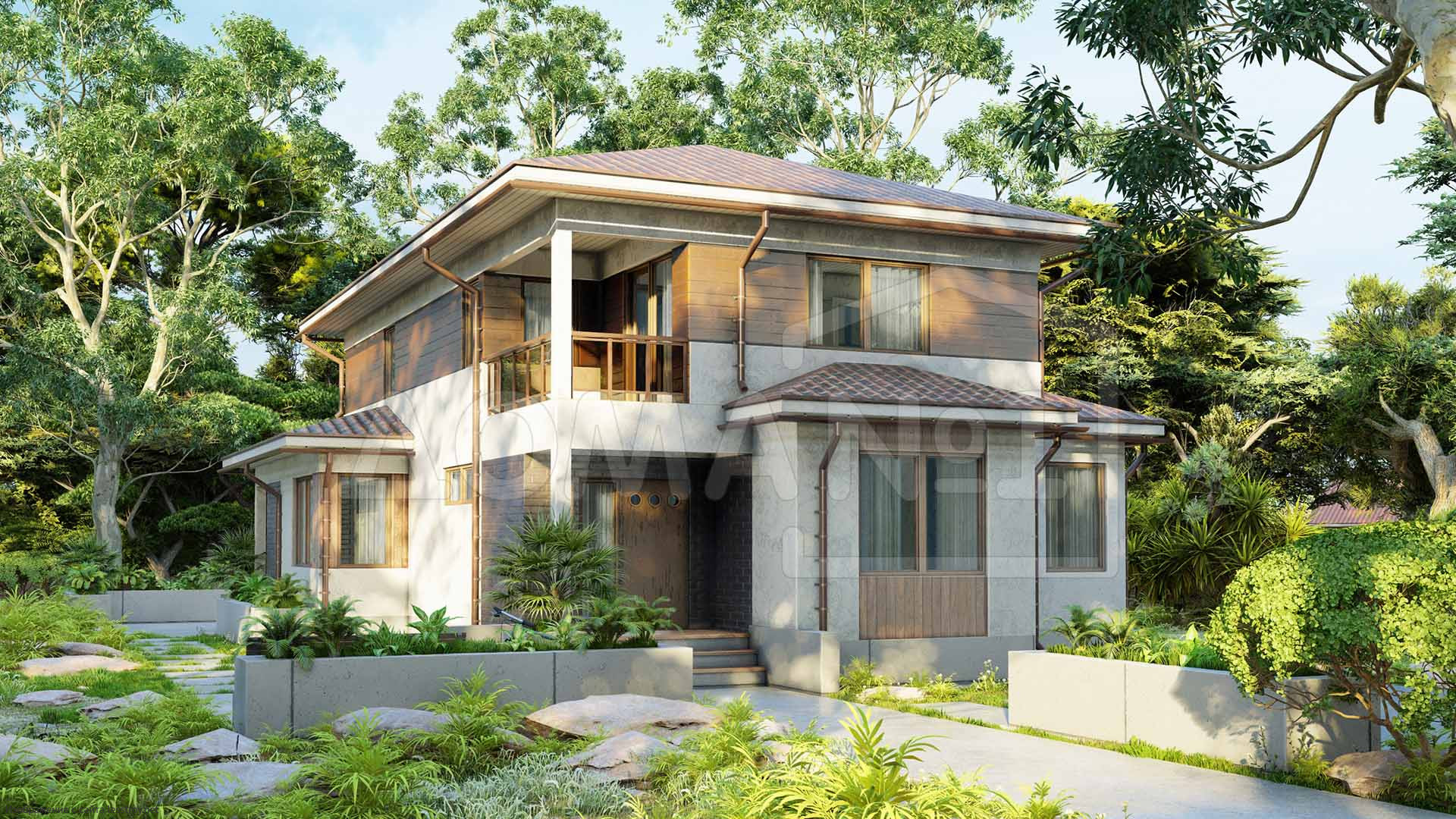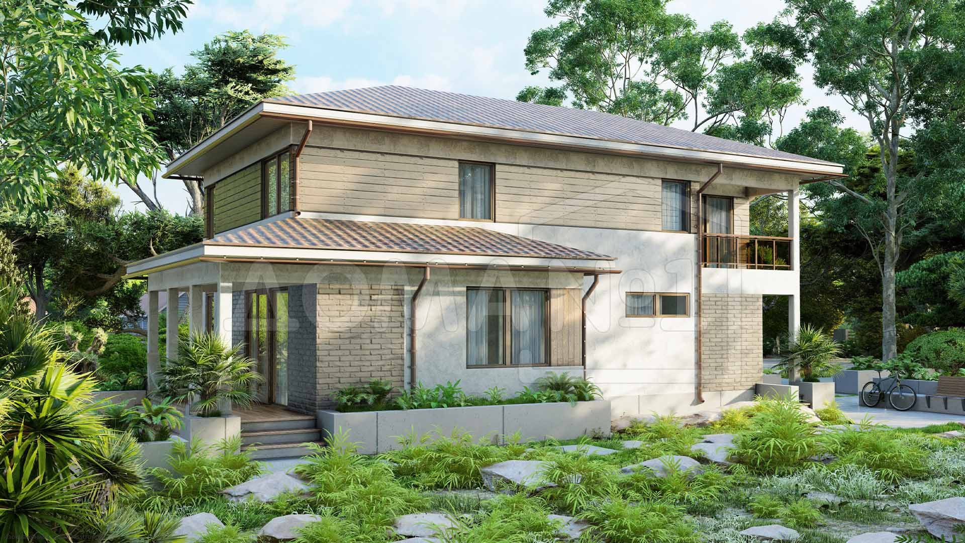 Здесь стекло и бетон гармонируют с теплом дерева и семейных уз.Площадь 114 м² — подходящий вариант для молодых семей. металлочерепица придаёт дому выразительность и надёжность. В доме предусмотрено 4 спальни, что важно для комфорта. Каркаса делает дом надёжным при любой погоде.Характеристики