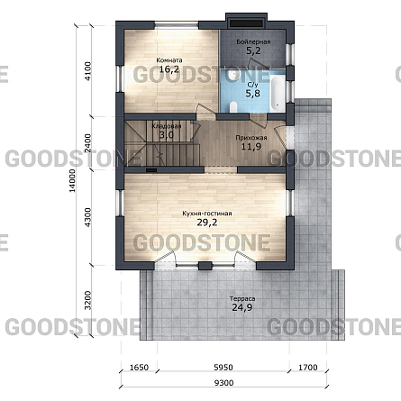 - Утепленная монолитная ж/б плита с ребрами жесткости вниз (бетон М350, толщина 200 мм, арм. ø12мм, шаг 200 мм; сечение ребер 400х400 мм, арм. Ø12 и 8 мм, шаг 200 мм; песчаная подушка 300 мм). Ленточный монолитный ж/б фундамент под террасу, гараж (при наличии)