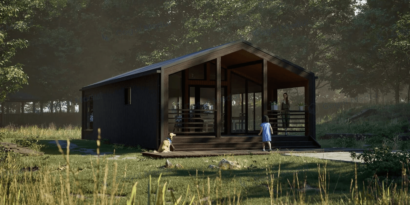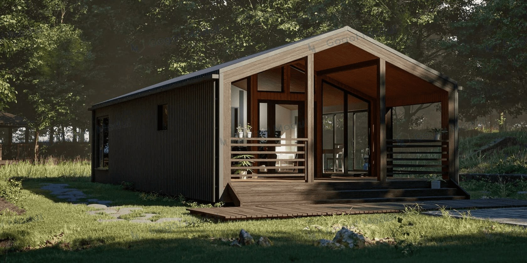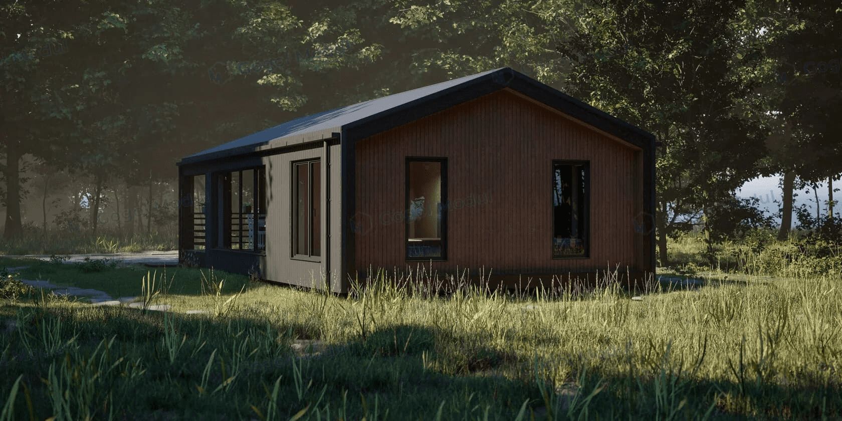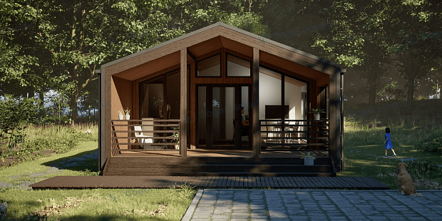 Проект одноэтажного дома Проект 3053 - каркасный дом-барнхаус с двумя спальнями и лофтом