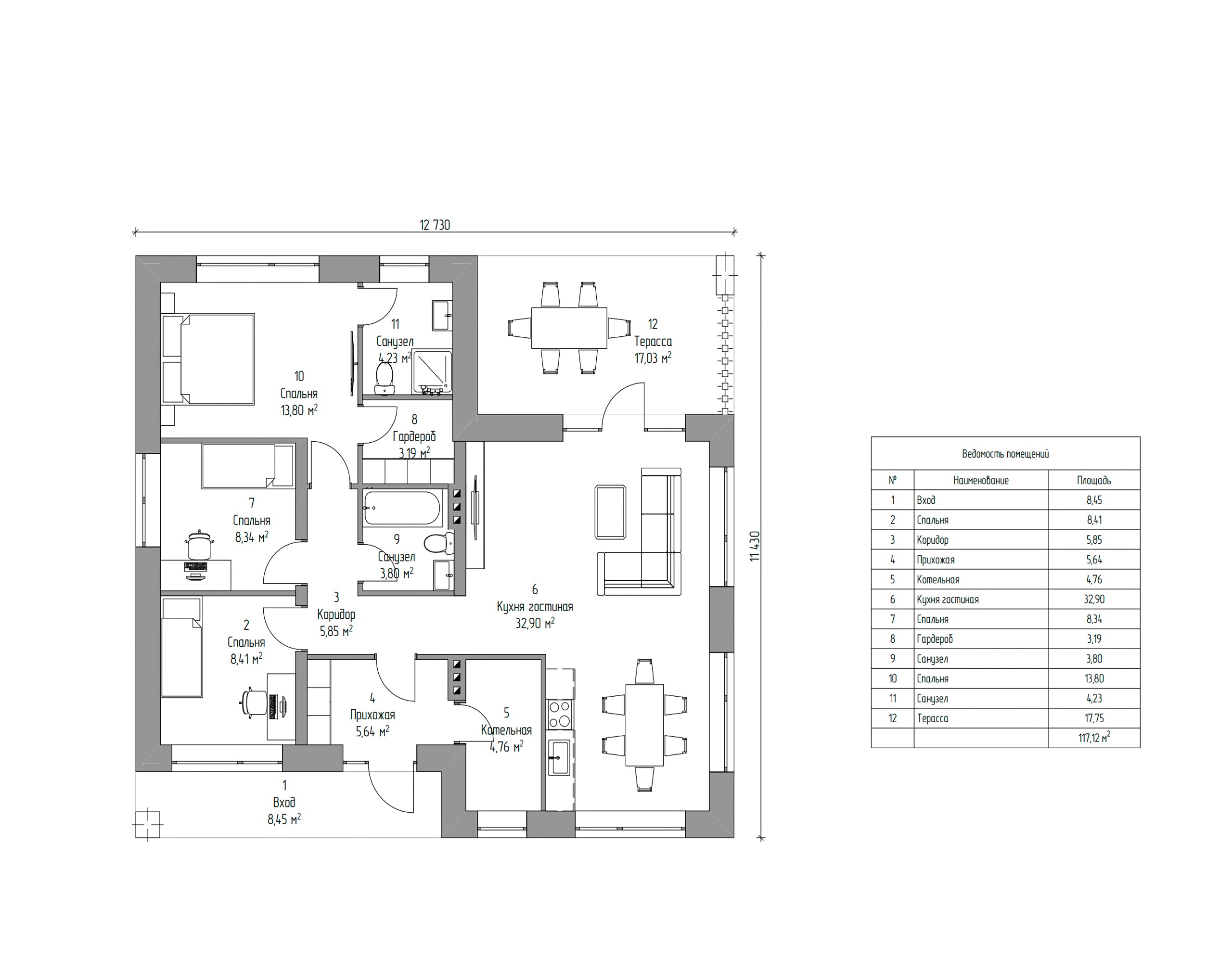 Дом площадью 118 м² с жилой зоной 86 м² сочетает в себе современный дизайн и практичность. Три спальни и два санузла создают удобное пространство для семьи. Газобетонные стены обеспечивают тепло и энергоэффективность, а продуманная планировка делает жизнь здесь комфортной. Это дом, где каждый найдет свой уголок для отдыха.Характеристики