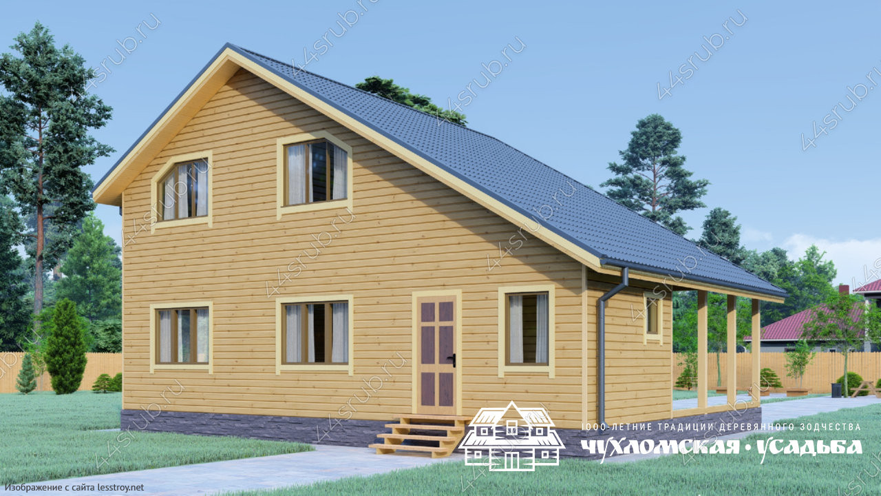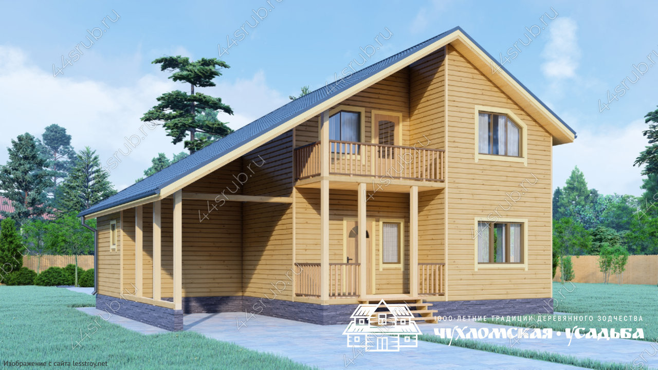 Проект двухэтажного дома Изборский клуб - проект дома-шале из бруса с навесом для авто и двумя отдельными входами