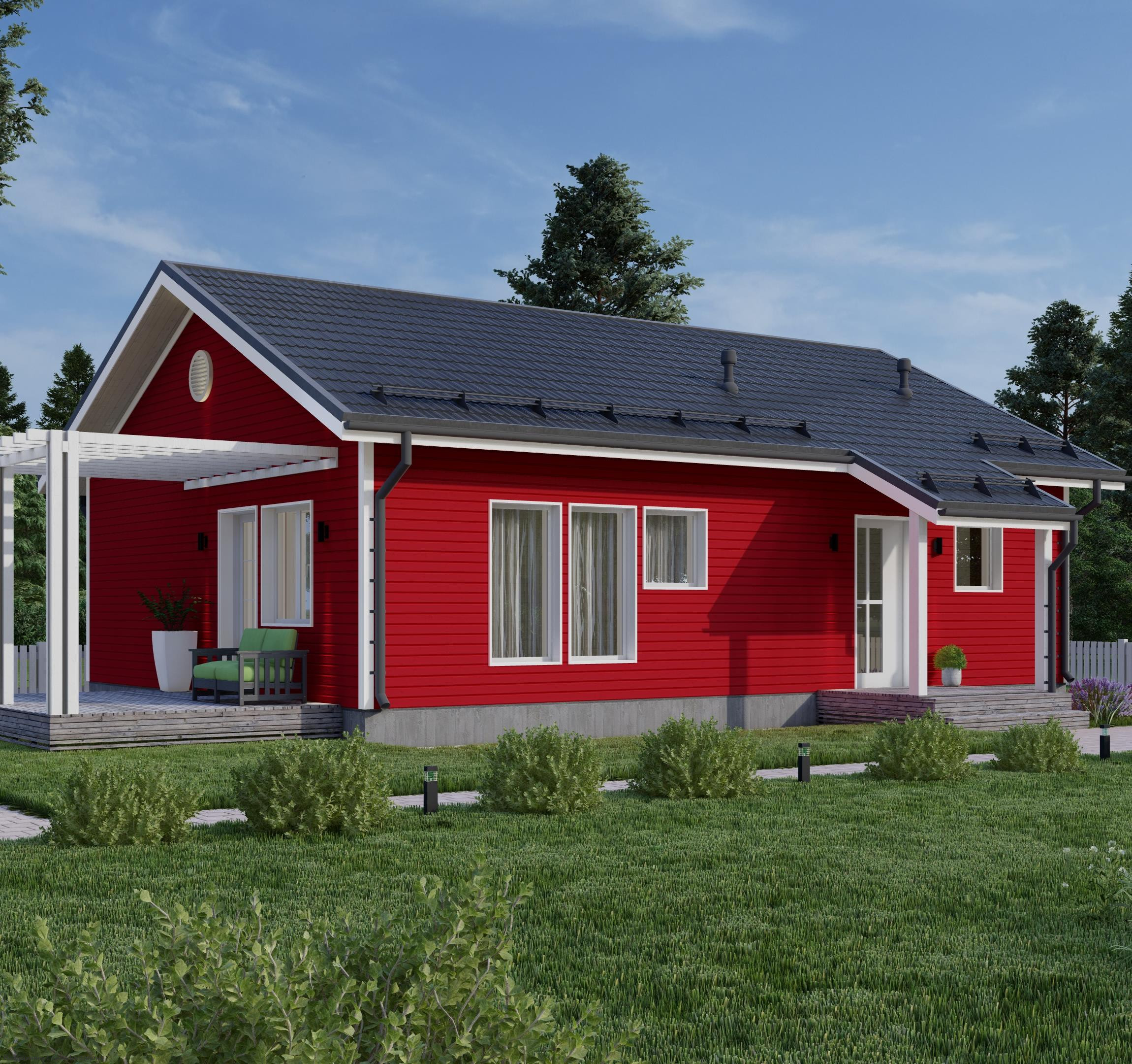 Уютный одноэтажный дом площадью 84 м² из SIP-панелей с битумной черепицей сочетает современные технологии и финский дизайн. Три компактные спальни с эргономичной планировкой обеспечивают комфорт для небольшой семьи. Идеальное решение для быстрого строительства без потери качества.Характеристики
