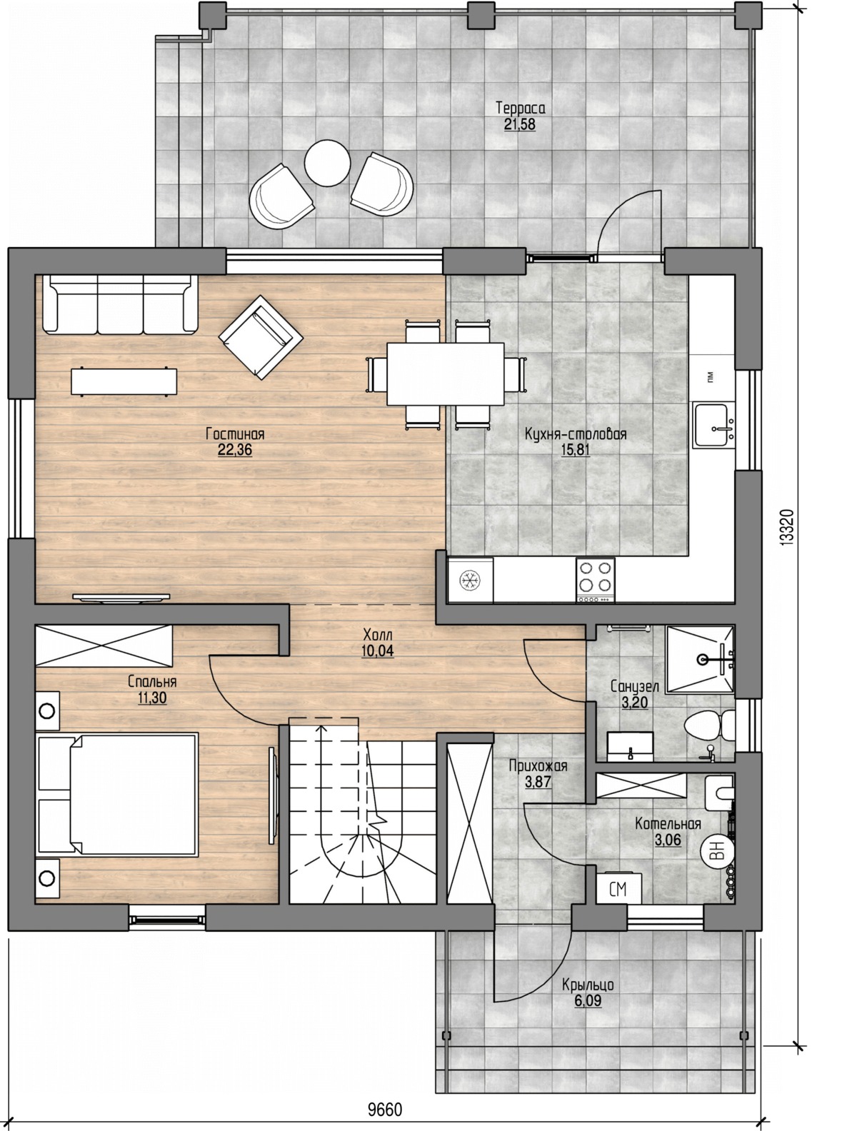 - Декоративные элементы: Имитация дерева, декоративная штукатурка «Ceresit Visage»