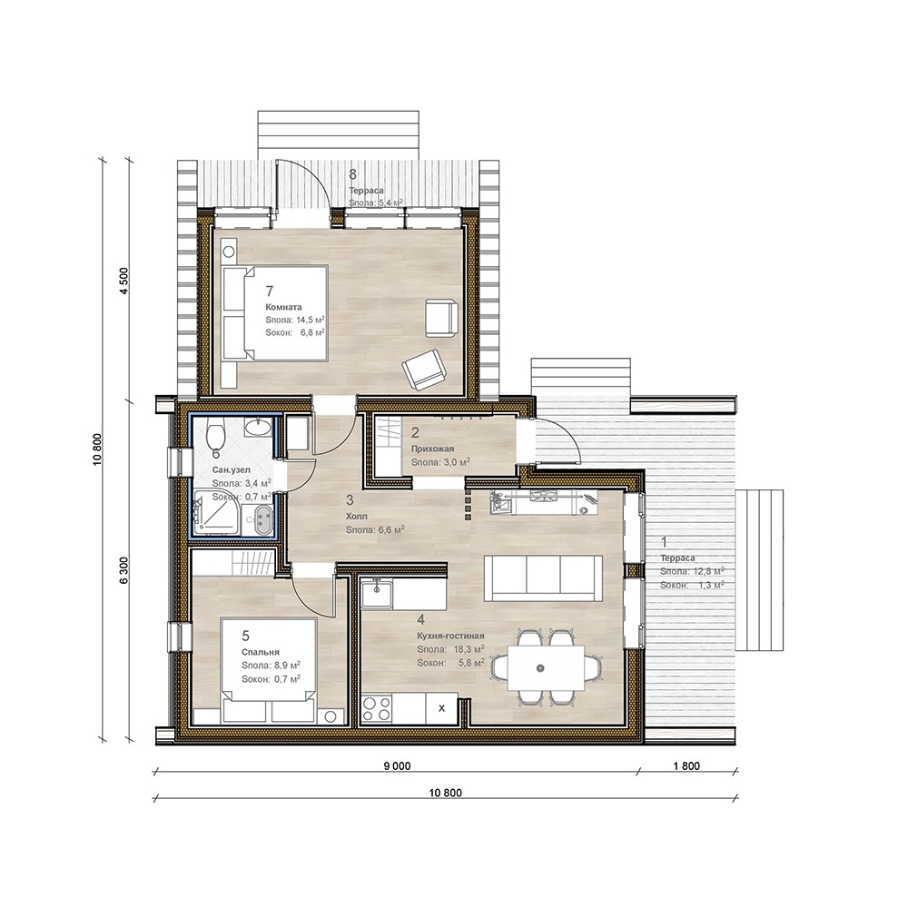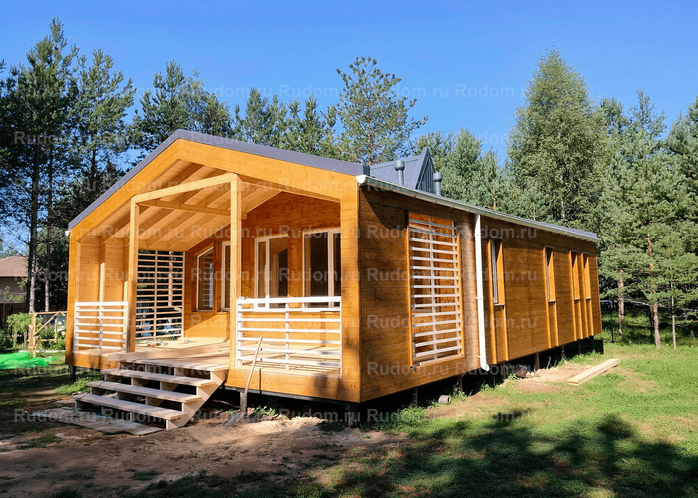 - Каркас внешних стен 1-го этажа усиленный из доски 38х147мм и террасы из строганной доски 32х144мм.