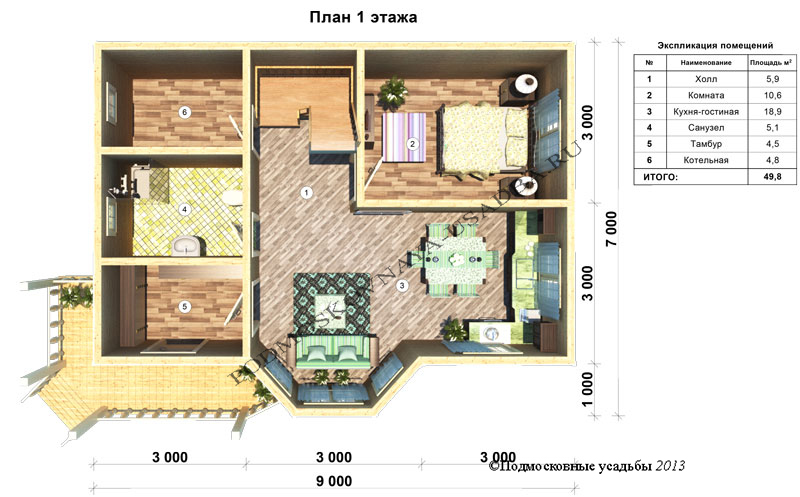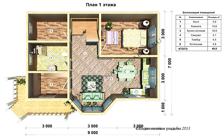 - Лаги пола: из бруса 100 х 100 мм с шагом 600 мм. Шпунтованная доска пола толщиной 28 мм