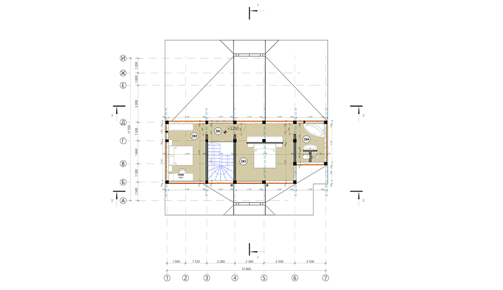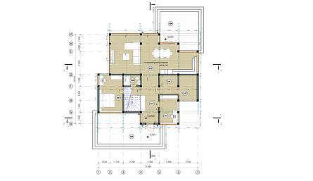 - Каркас Фахверк - опорно-балочная конструкция из клееных конструкционных балок, стойки угловые 240х240, рядовые 180х240, обвязки 240х240, прогоны 360х80, «лобовая доска» - клееная конструкционная балка.