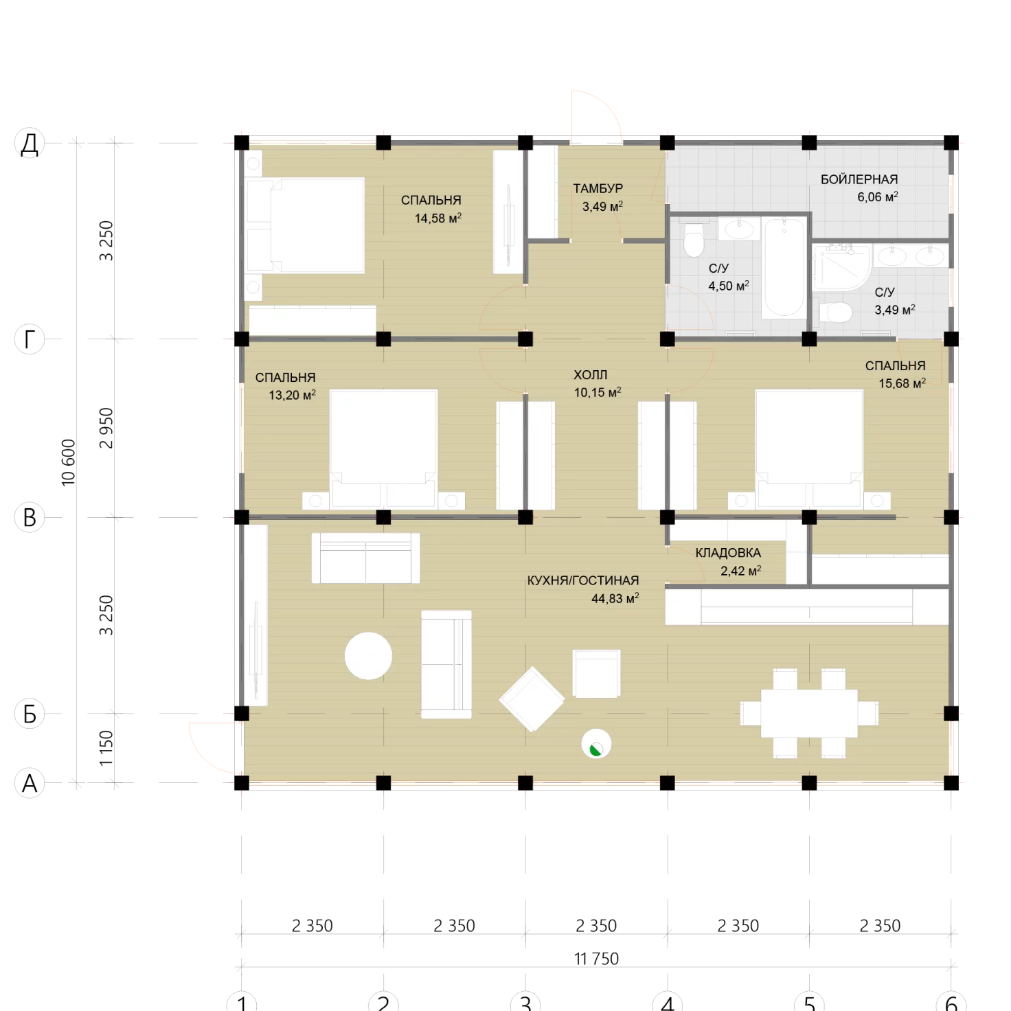 - Выбор фундамента и системы отопления предоставляется заказчику исходя из особенностей рельефа и технических условий на земельном участке.