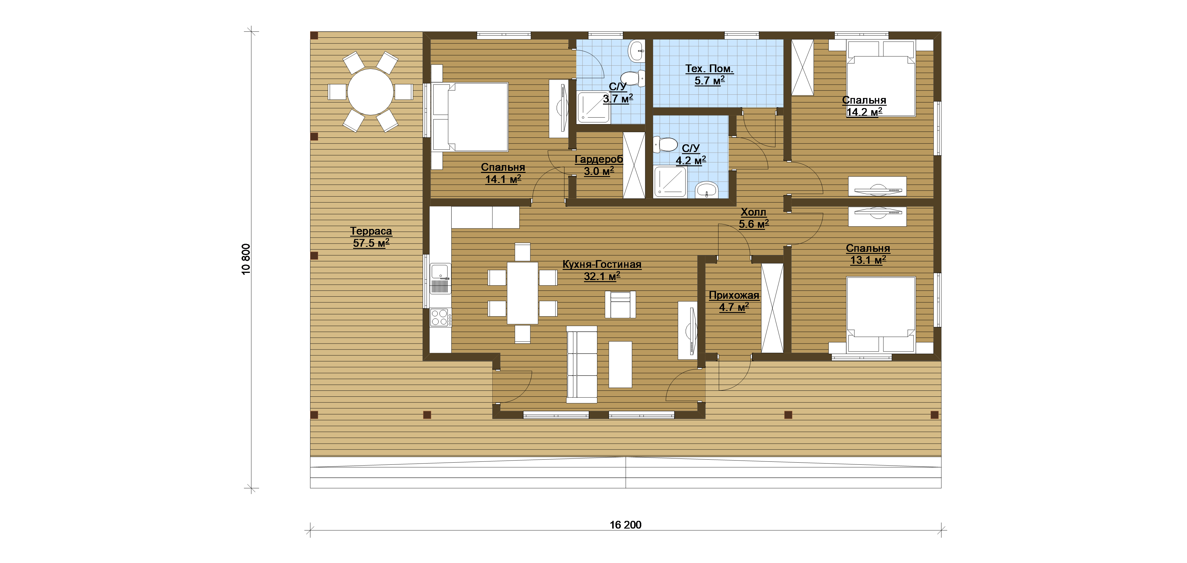 Проект одноэтажного дома Проект 7032 - одноэтажный каркасный дом с сауной