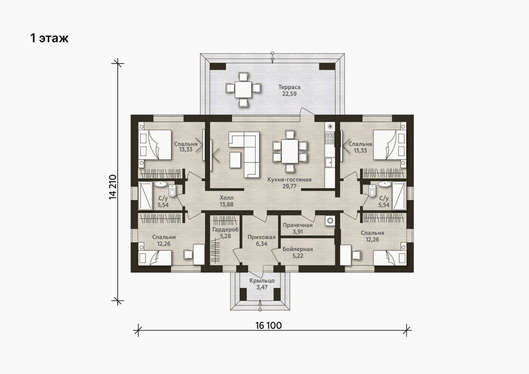 Проект одноэтажного дома со вторым светом и террасой