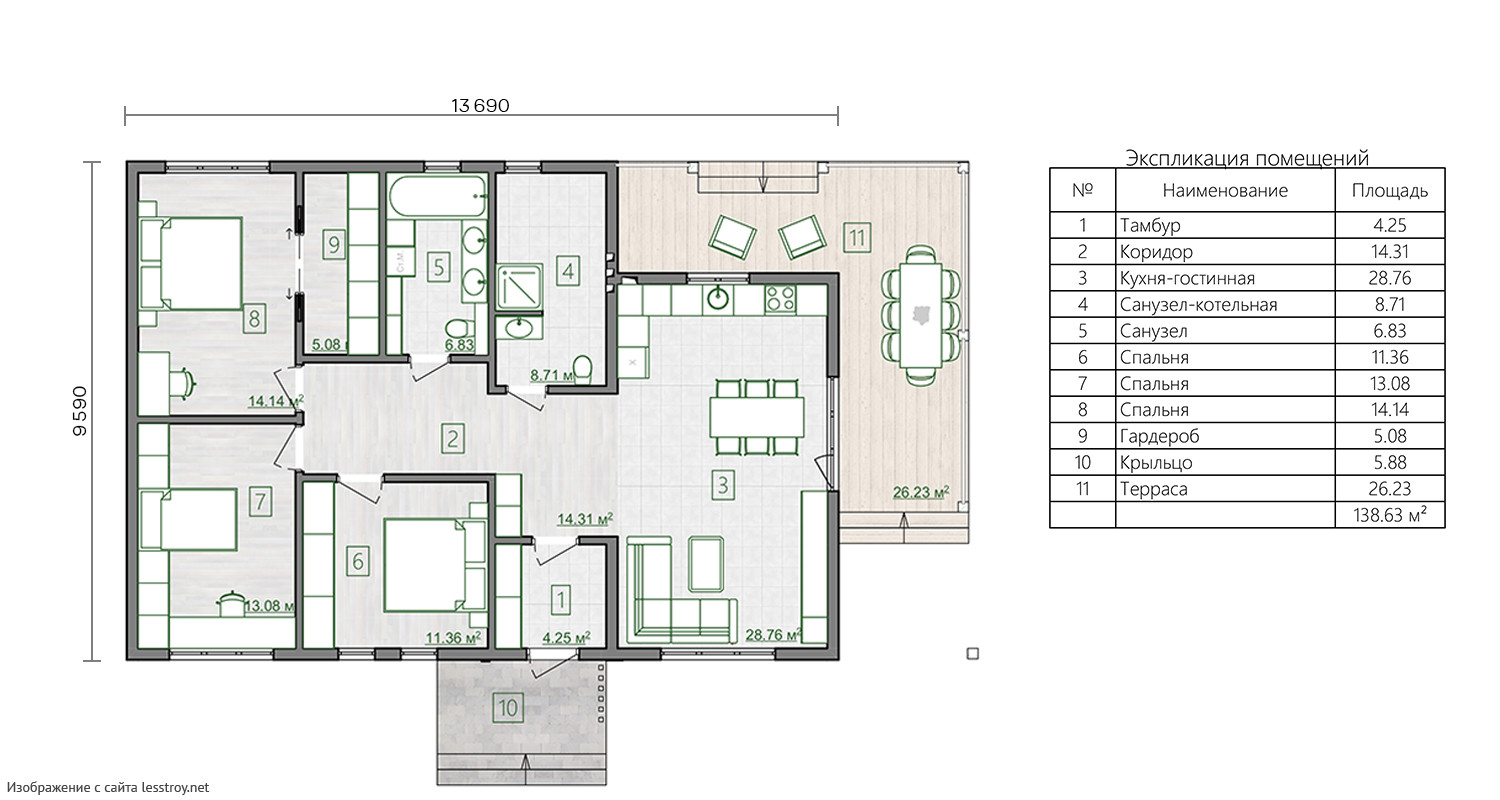 Дом, где можно выращивать зелень и травы круглый год. Площадь 138 м² открывает простор для креативных решений. металлочерепица придаёт дому выразительность и надёжность. Дом спроектирован в духе дома в классическом стиле. Количество спален — 3, делая планировку гибкой.Характеристики