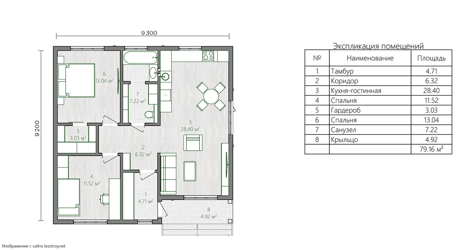 Пространство, в котором двери не мешают расстановке мебелиДом продуман на 80 м² до последнего сантиметра. В качестве кровли использована металлочерепица — материал, проверенный временем. Архитектура выполнена в стиле дома в классическом стиле. Наличие 2 спальни удовлетворит запросы семьи с детьми.Характеристики