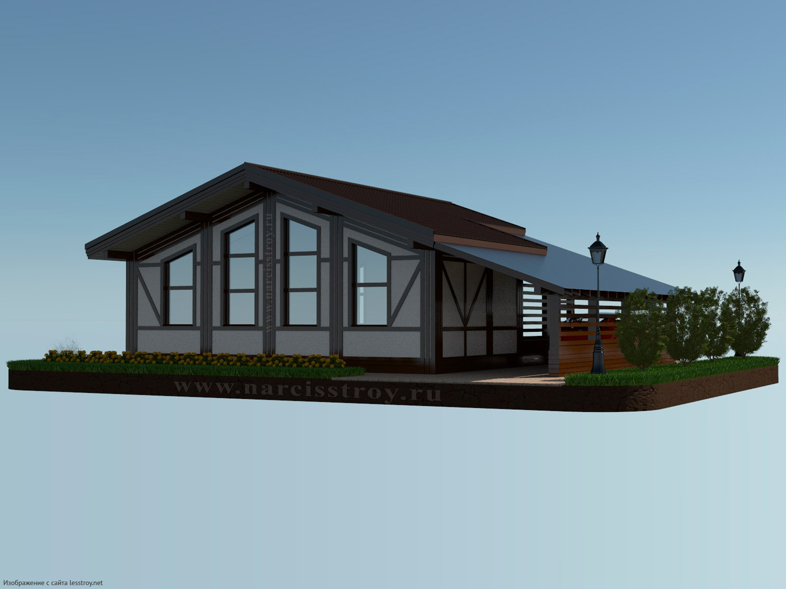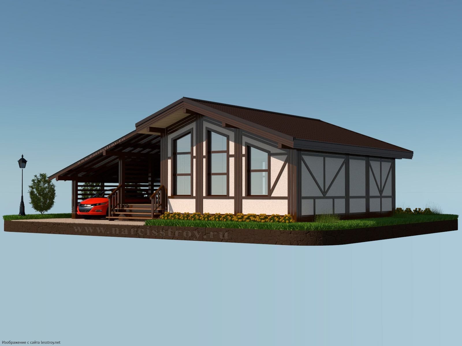 Компактный каркасный дом площадью 108 м² в стиле фахверк с металлочерепичной крышей. Вместительный навес для парковки и 2 спальни делают его практичным для небольшой семьи. Современный дизайн и функциональность сочетаются в этом проекте. Отличное решение для загородного отдыха.Характеристики