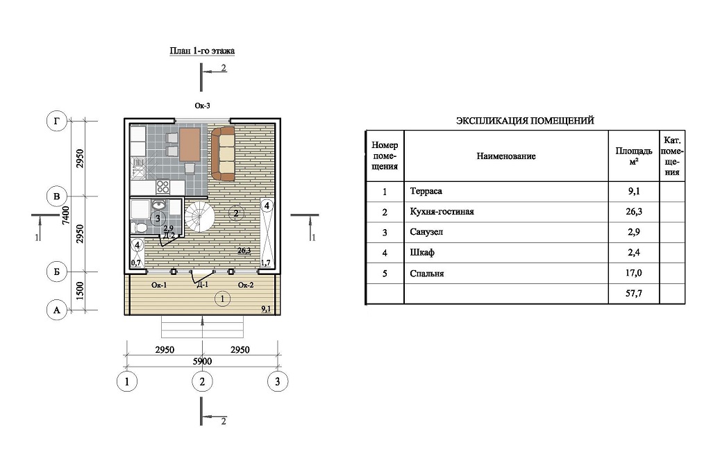 - Общая площадь: 57 м2