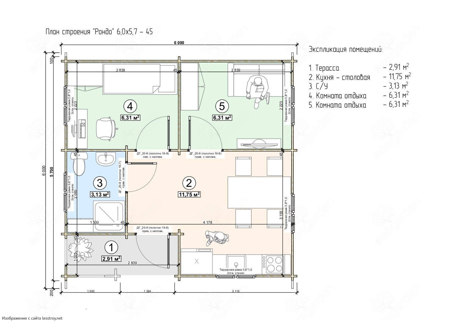 Проект одноэтажного дома Садовый домик Рондо 6.0x5.7 м, площадь 30.5 кв.м., брус 135х45/60/90