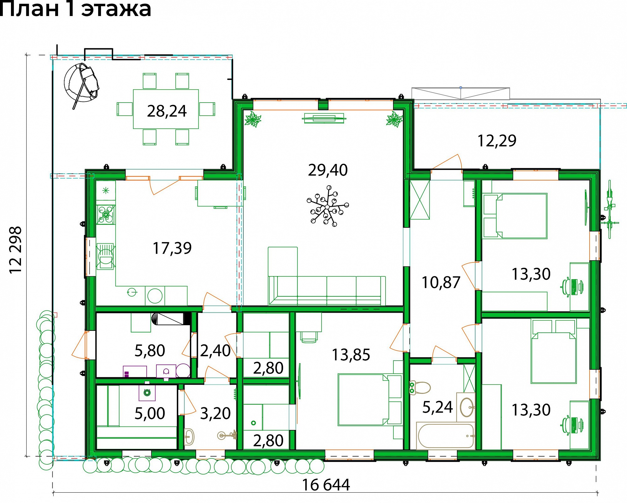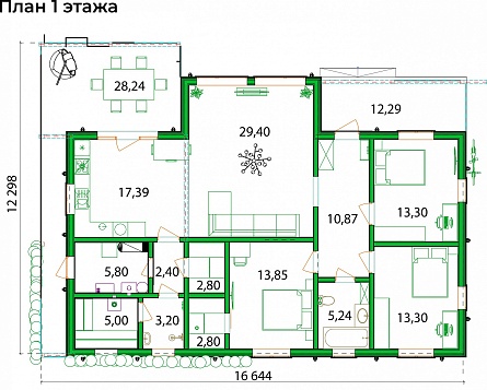 Проект одноэтажного дома Просторный, под ключ, ламинат, двери Экошпон, отделка Hauberk, коммуникации, сантехника.