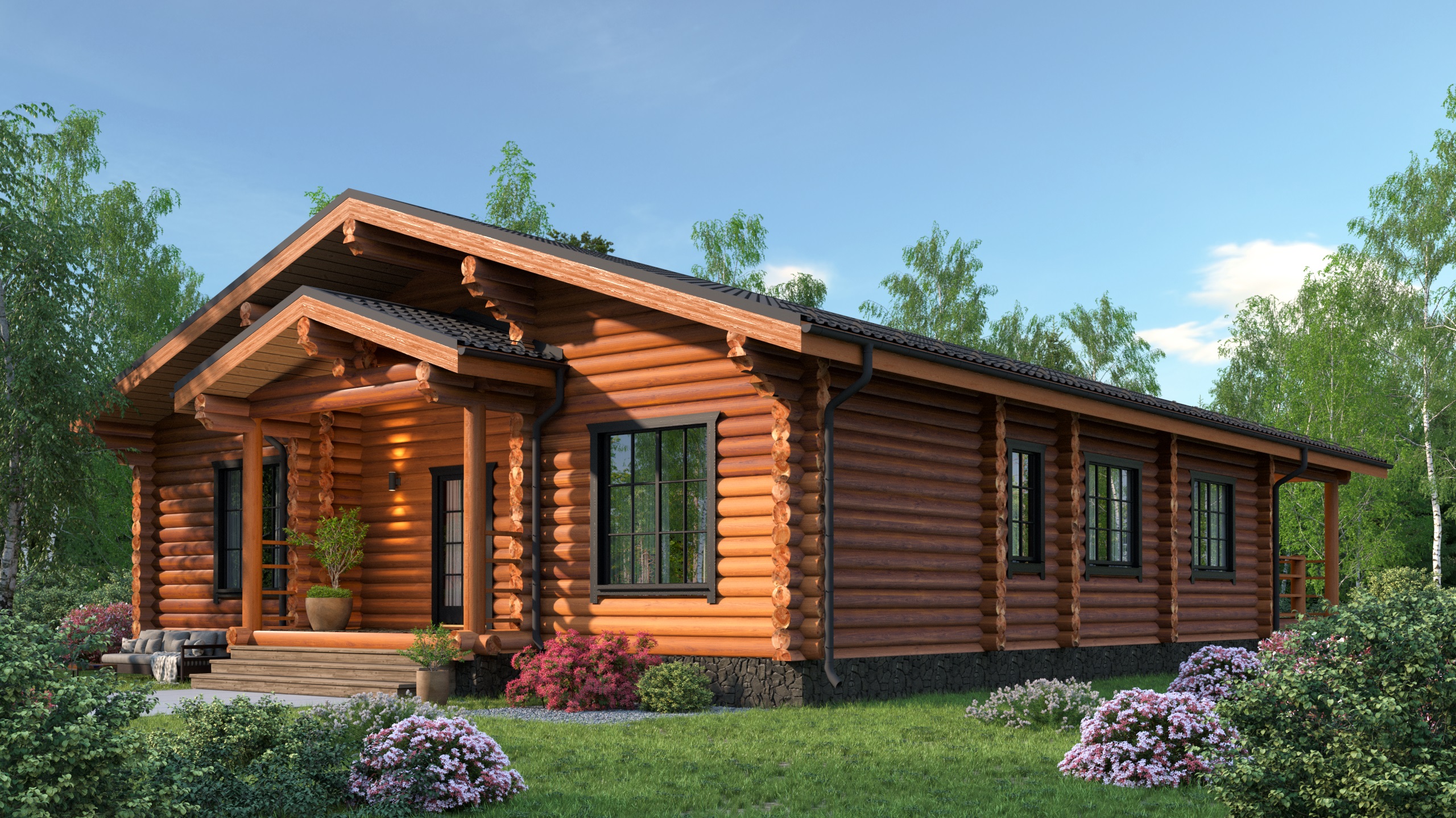 Просторный дом из бревна площадью 230 м² с четырьмя спальнями в стиле кантри идеален для большой семьи. Один этаж и металлочерепичная кровля делают его надежным. Натуральное дерево создает уютную атмосферу. Проект «Сергиев Посад» — это воплощение традиций и комфорта.Характеристики