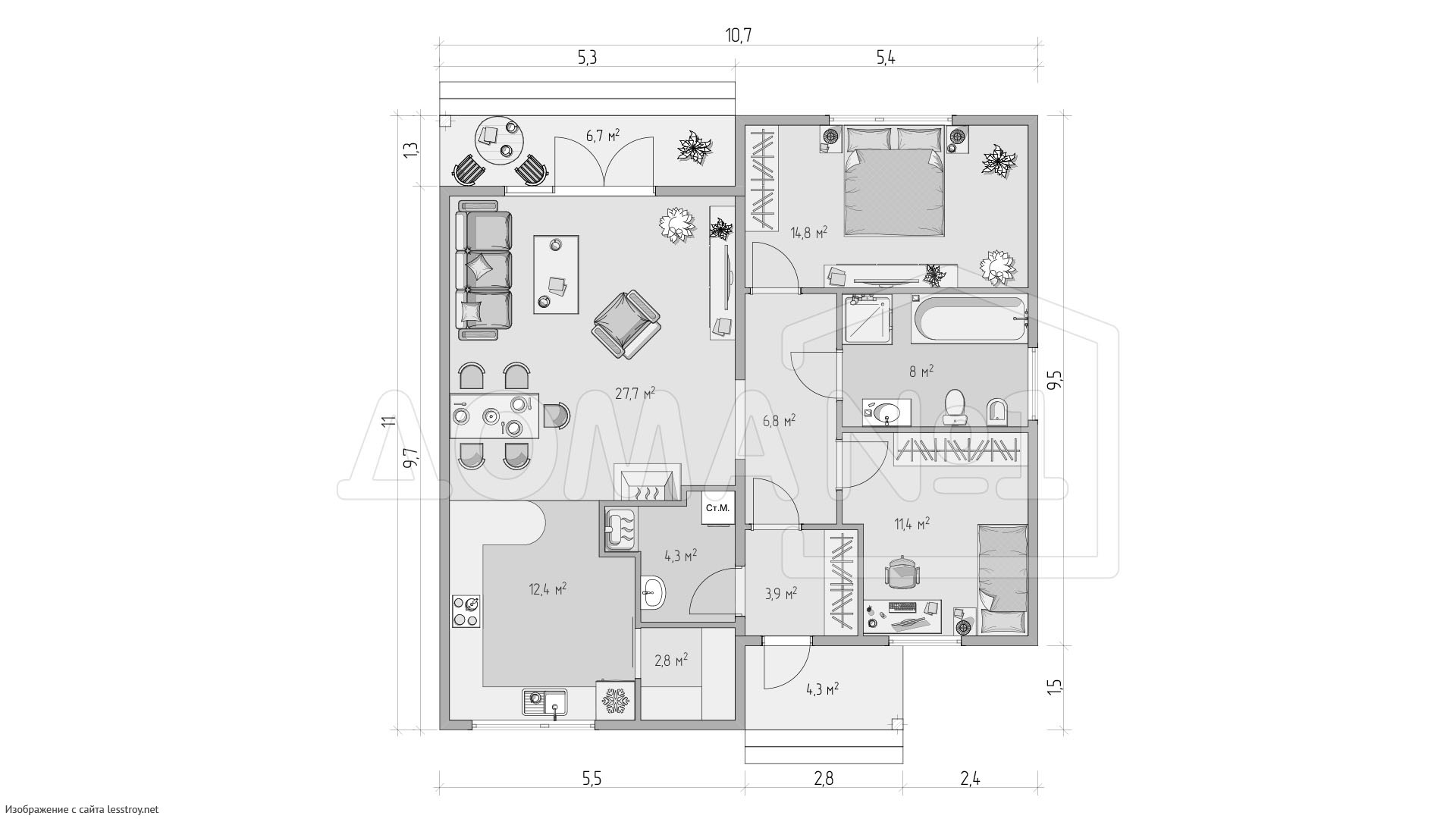 Пространство, в котором не нужно наклоняться за нужной вещью. С такими параметрами (114 м²) легко зонировать пространство. металлочерепица придаёт дому выразительность и надёжность. Проект включает 2 спальни — удобно для семьи. Одноэтажная рациональная планировка создаёт идеальные условия для жизни всей семьи.Характеристики