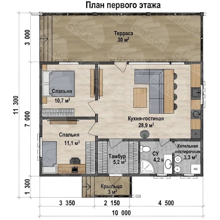 Компактный дом площадью 103 м² с жилыми 95 м² предназначен для семьи с одним ребенком. Каркасные стены обеспечивают тепло и легкость, а металлочерепица надежно защищает от непогоды. Интерьеры продуманы до мелочей, сочетая функциональность и гармонию. Это идеальное решение для тех, кто ценит уют и практичность.Характеристики