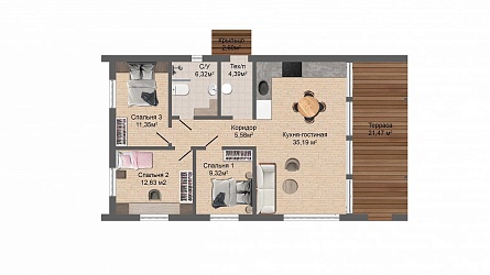 Этот дом площадью 136 м² с жилой зоной 99 м² создан для семьи с двумя детьми, предлагая простор и удобство. Каркасные стены дарят надежность, а естественные материалы добавляют ощущение близости к природе. Светлые комнаты и рациональная планировка делают жизнь здесь по-настоящему комфортной.Характеристики