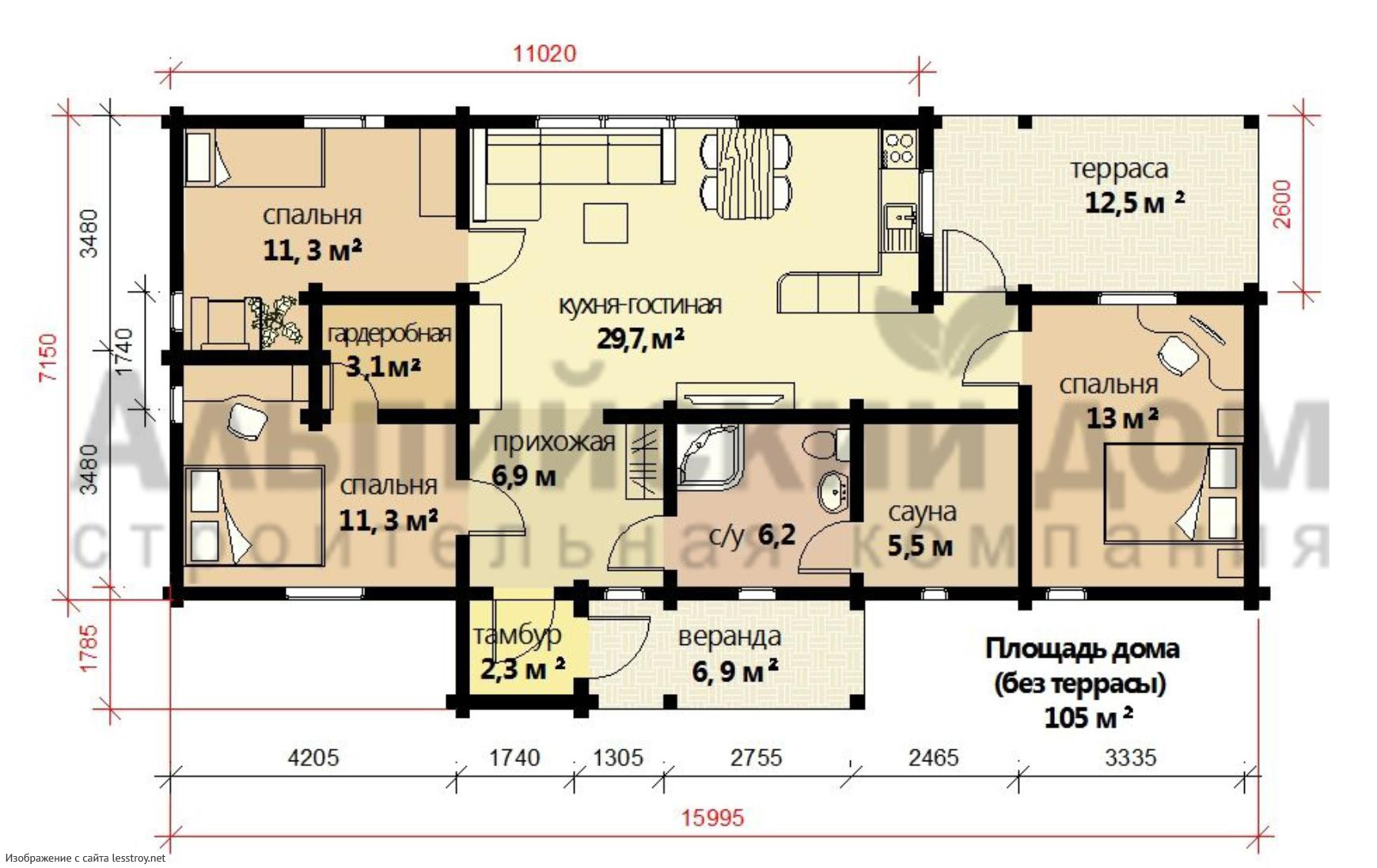 Проект одноэтажного дома Одноэтажный дом из бруса 12.8х12.4 ДБ-8