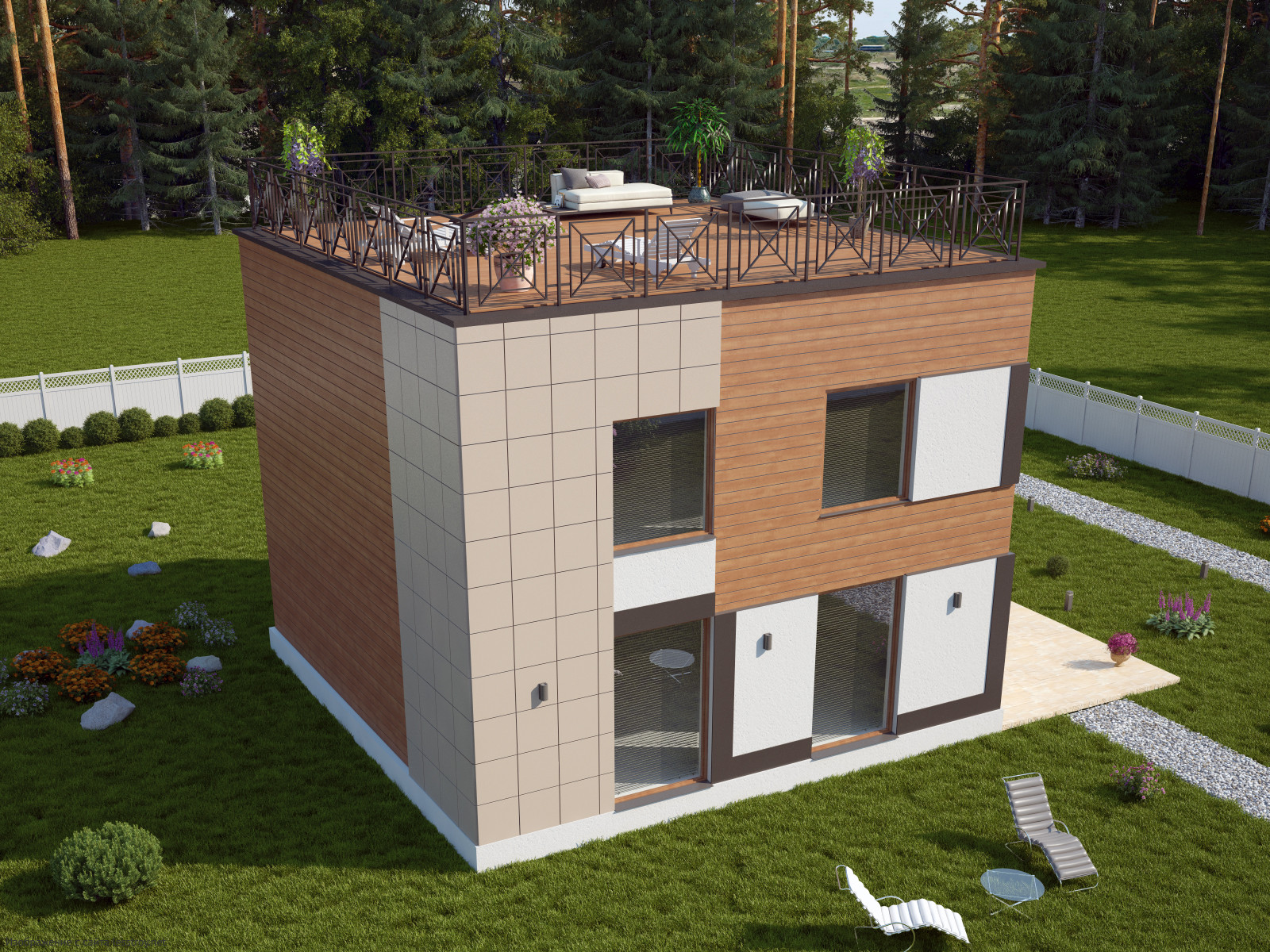 Современный каркасный дом площадью 143 м² с тремя спальнями отличается плоской кровлей. Рубероид и стиль хай-тек делают его уникальным.Характеристики