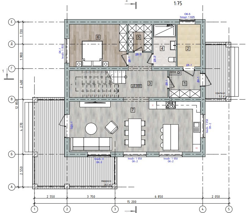 - Утепленная монолитная плита с усиленными ребрами жесткостями под несущие стены, теплоизоляция фундамента и грунта.