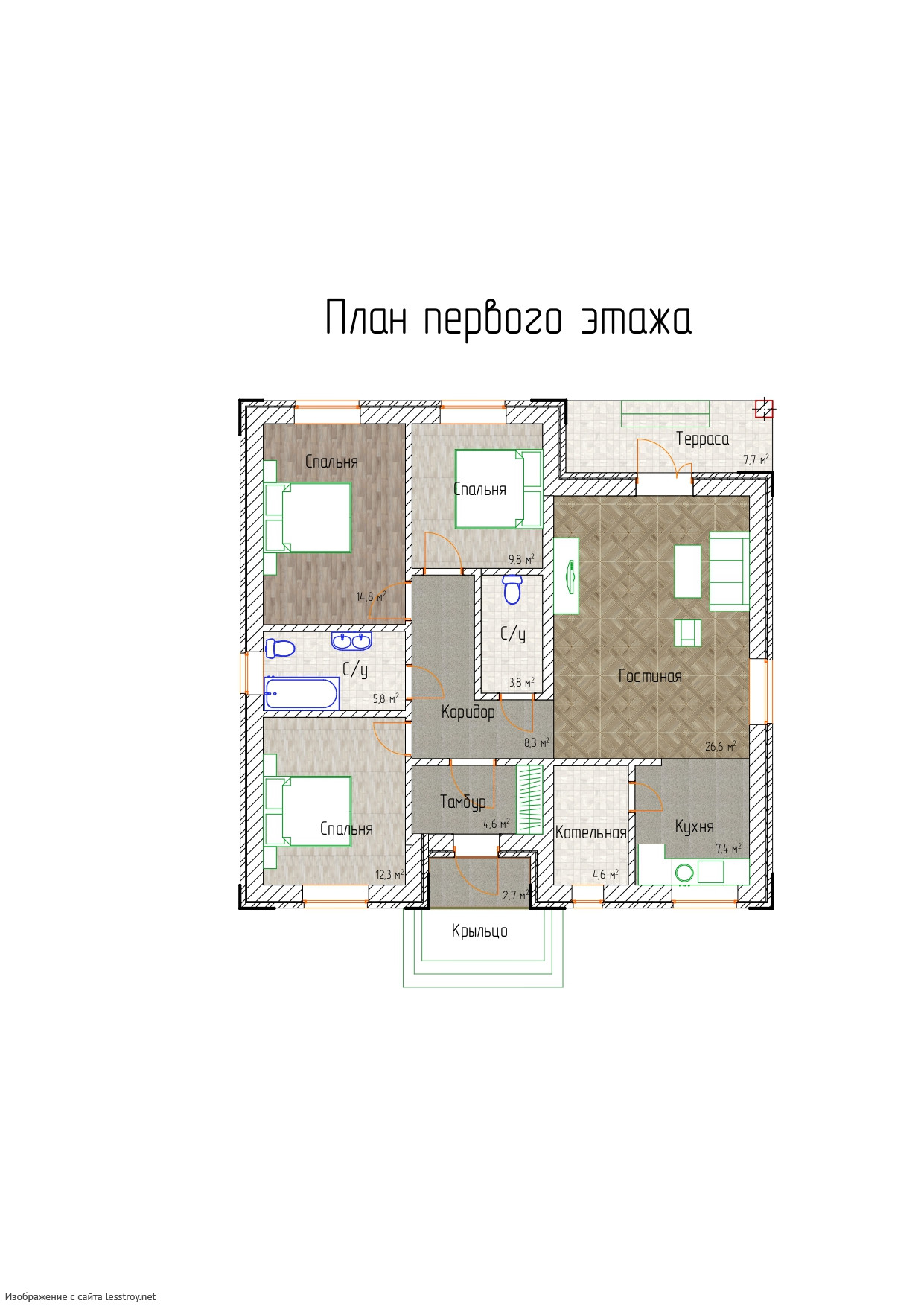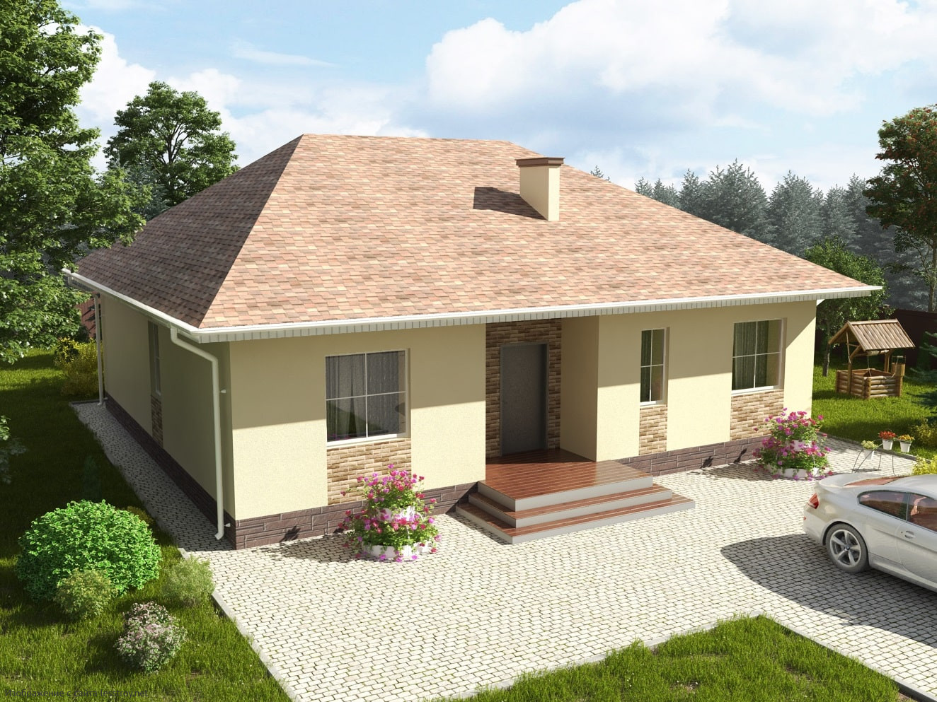 Архитектура здания — это удачный союз красоты и удобства. Дом продуман на 108 м² до последнего сантиметра. Одноэтажная рациональная планировка делает зонирование более логичным. Газобетона делает дом надёжным при любой погоде. Проект включает 3 спальни — удобно для семьи.Характеристики