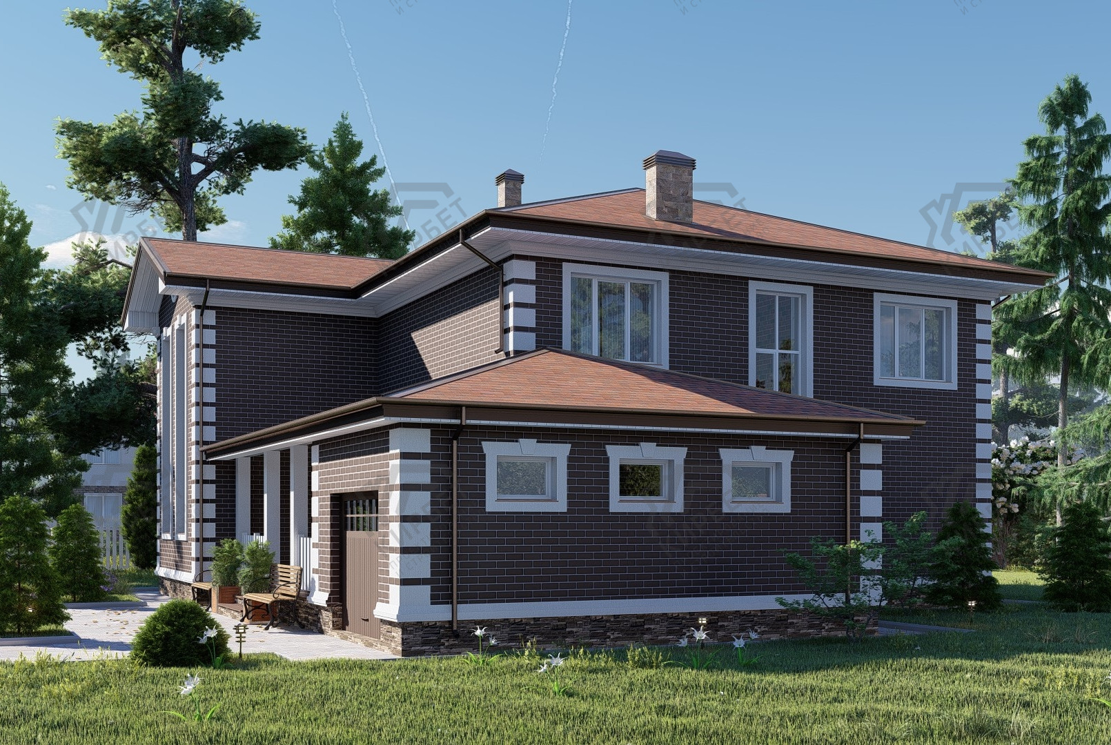 Двухэтажный дом из керамических блоков площадью 345 м² с четырьмя спальнями и вальмовой крышей. Черепичная кровля и отсутствие отделки позволяют реализовать любые дизайнерские идеи. Простор и качество в каждой детали.Характеристики