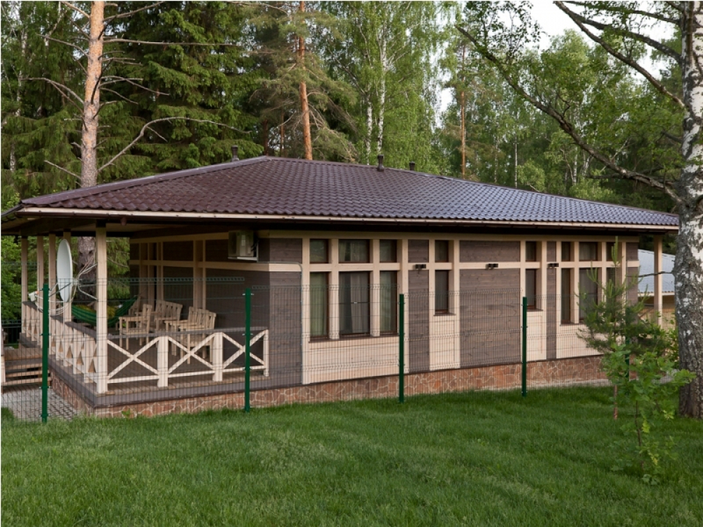 Пространство, в котором рождаются светлые планы. Дом объёмом 163 м² — пример грамотного проектирования. Материал кровли — металлочерепица, что добавляет зданию индивидуальность. Архитектура выполнена в стиле дома в стиле шале. Одноэтажная просторная планировка делает зонирование более логичным.Характеристики