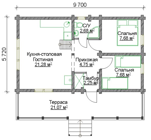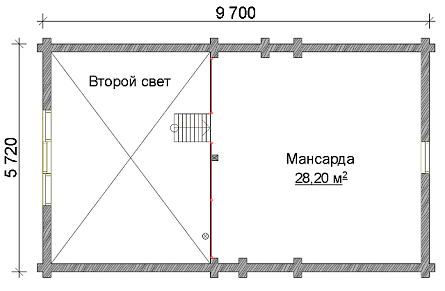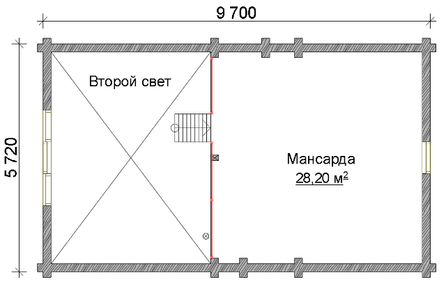 - Стены, перегородки, фронтоны – оцилиндрованное бревно (сосна-ель) высота этажа 2,9м.