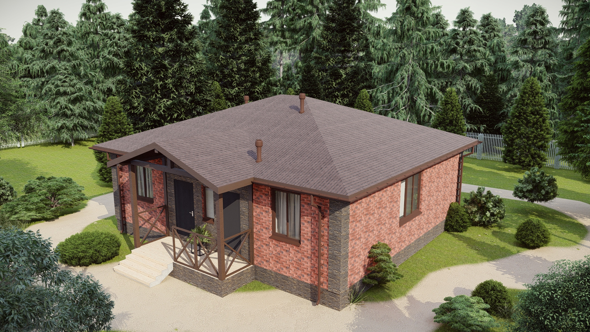 Современный одноэтажный каркасный дом площадью 119 м² с четырьмя спальнями из SIP-панелей – образец энергоэффективного строительства. Битумная черепица придаёт лёгкость облику, а продуманная планировка делает жизнь комфортной.Характеристики