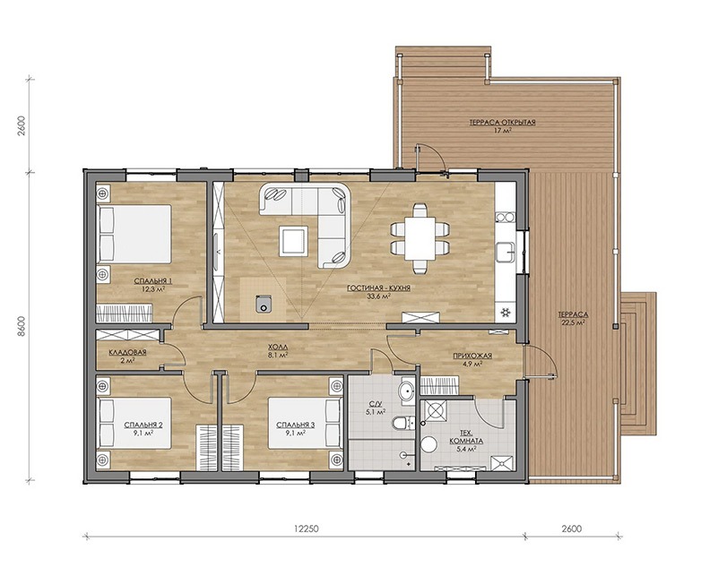 - Стропильная система из строганой доски камерной сушки сечение 190мм*45мм или фермы на МЗП, технология MiTek в зависимости от параметров проекта